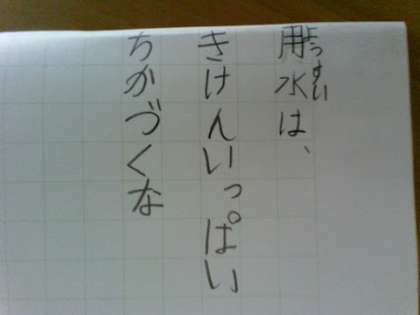 「用水は きけんいっぱい ちかづくな」 2年1組 M.R