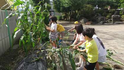 8月28日(水)すみれ・ひまわり級 ポップコーンの収穫です 公開日 2024/08/28 更新日 2024/08/28 すみれ・ひまわり ポップコーンの収穫をしました。太くて大きな茎を持って、「よいしょよいしょ」と協力して引き抜きました。