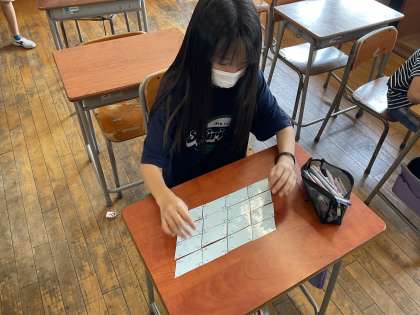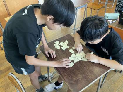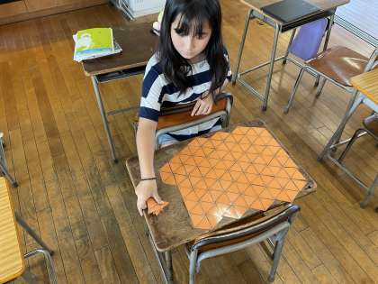 算数の学習では、6種類の図形を操作しながら、しきつめられる形について調べています。一人で並べたり仲間と相談したりしながら、しきつめられる形かどうか考えています。