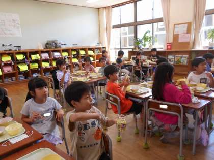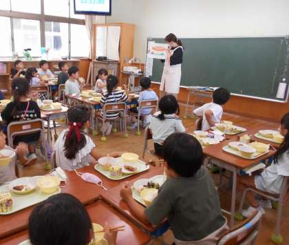 給食の時間に、栄養教諭から朝ご飯やバランスのよい食事の大切さについてお話がありました。時々反応しながら、話を真剣に聞いていました。