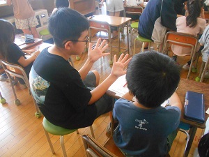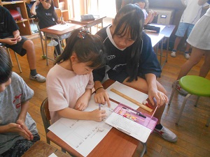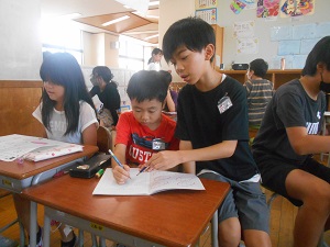 総合の学習で、2年生との交流を行いました。筆算が分からなくて困っている2年生に優しく教えたり丸付けをしてあげたりする5年生です。