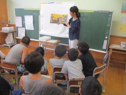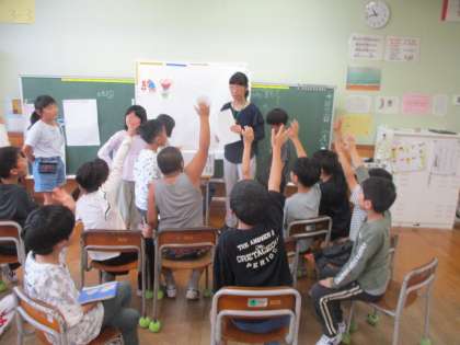 最初に司書の中沢先生による読み聞かせとクイズを行いました。クイズは昔話の題名を当てるクイズでした。たくさんのクイズとその答えのイラストを作っていただき、大盛り上がりでした。時間の都合ですべてできなかったですが、またどこかの機会であるかもしれませんね。