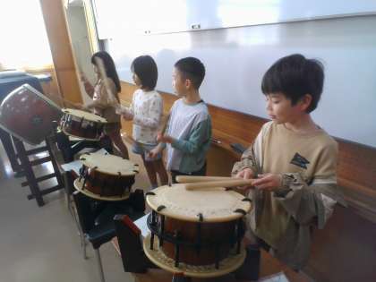 グループでお祭りのようなリズムをつくりました。「ドンドコ」「ドンドン」「ドコドコ」「スコドン」「ドンウン」等、好きなリズムを繰り返して演奏しました。