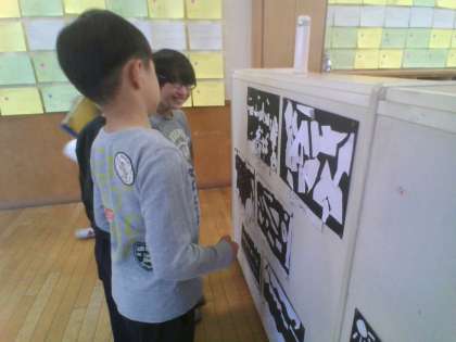 今日は友達の作品をじっくり見て、作品の素敵なところをたくさん見つけました。「ギザギザやぐるぐるなど、いろんな切り方があっておもしろい」「切った紙を重ねて魚の形になっていてすごい」とワークシートに書きました。
