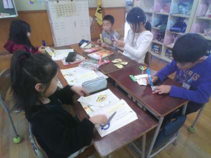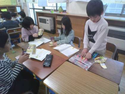 国語科の学習では、「紙コップ花火の作り方」で説明の仕方を学習しました。今度は、自分たちがおもちゃ作りの説明文を書きます。そのために、今日は給食の牛乳パックを使って「ぶんぶんごま」を作りました。作り方を確認しながら、楽しくおもちゃ作りができました。明日は、作り方を文章に書いていきますよ。