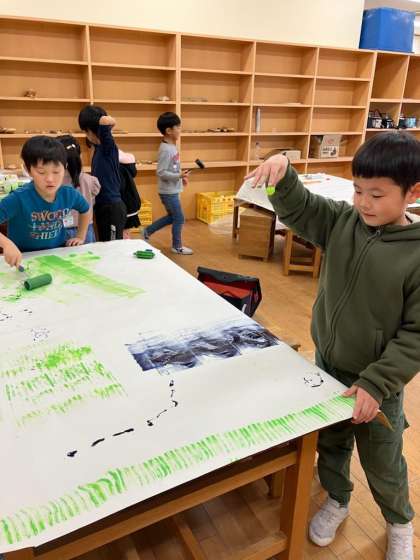 班で1枚の大きな模造紙に、様々なもので「ぺったん コロコロ」しました。