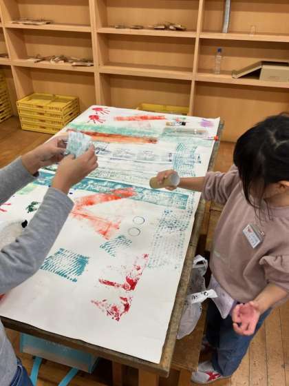 家から持ってきたトイレットペーパーの芯やペットボトルキャップなど、スタンプのようにおしたりローラーのように転がしたりしていました。