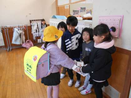 あいさつ係は朝教室の前に立ち、あいさつを返してくれた人に桜の花を渡しています。模造紙に木の枝を描き、そこに桜の花を貼ることで、3月には満開の桜の木ができあがる予定です。