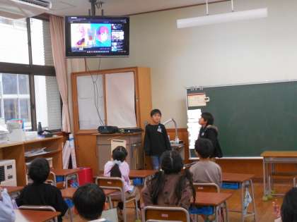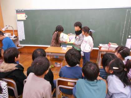 図書係は自分たちで図書室へ本を探しに行き、みんなの前で読み聞かせしています。また、クラスのみんなへのプレゼントとして、しおりを作成中です。