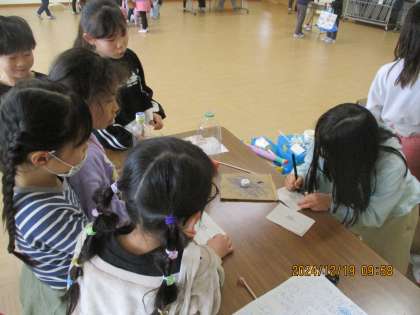 自分たちのおもちゃコーナーに誘って、1年生におもちゃの作り方を教えるグループもありました。つくり終わった後には、折り紙でつくった景品を渡すととても喜んでくれて、大切そうに持ち歩いている1年生の姿もありました。