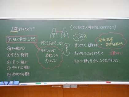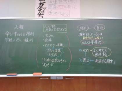 1組では、人権に関する動画を見て、人権とは大人も子供もすべての人がもっている大切な権利であることを学びました。しかし、権利があるからといって、自分の主張がすべて通るわけではありません。子供たちは「権利をもっているのは自分だけではないから、他の人の権利も大切にしなければならない」「自分だけが権利を主張するのではなく、みんな平等にした方がよい」と発言するなど、他者の権利についても考えていました。