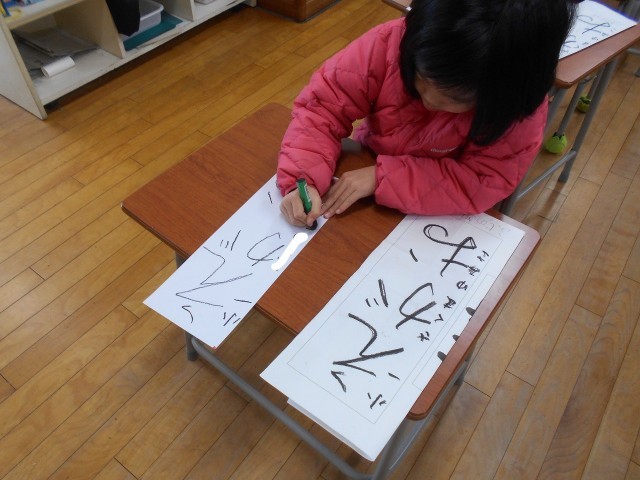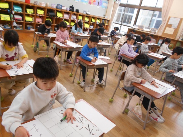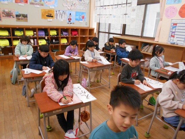 書初大会では、冬休み中の練習の成果が出せて満足している子供や、納得がいく字が書けず悔しそうな表情を見せる子供がいました。しかし皆、静かに、集中して「えがお」という字を書いていました。