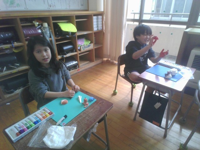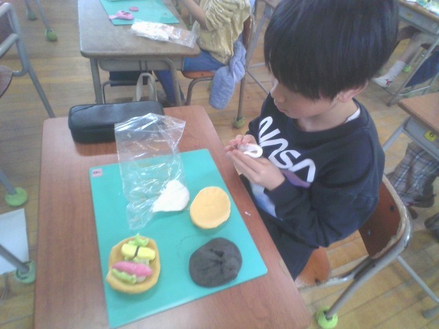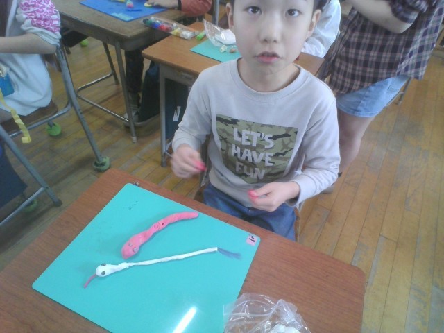 紙粘土に絵の具を入れてにぎにぎ。色がつくとおもしろいですね。自分の好きな色をつけて好きな形やものを作りました。