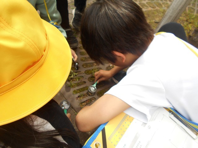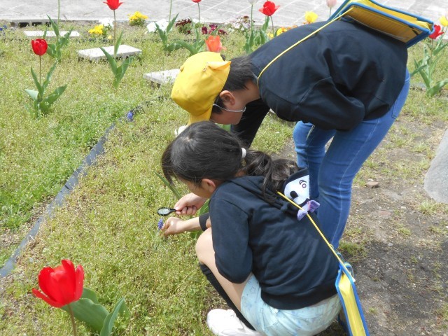 今日の理科では、春の生き物を探しにいきました。春になり、アリやアメンボなどの虫がいたり、チューリップなどの花が咲いていたりしました。虫眼鏡を使い、細かいところまで観察しました。