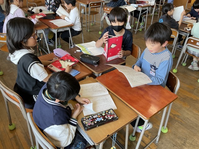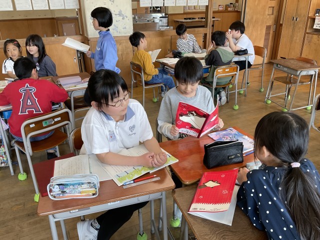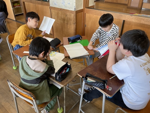 物語の登場人物がどのような人物なのか、各場面での様子や言動などから考えたことをグループの仲間に伝えています。
