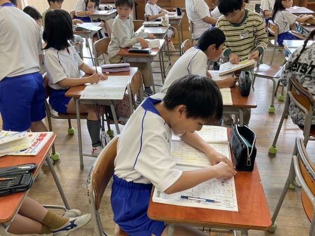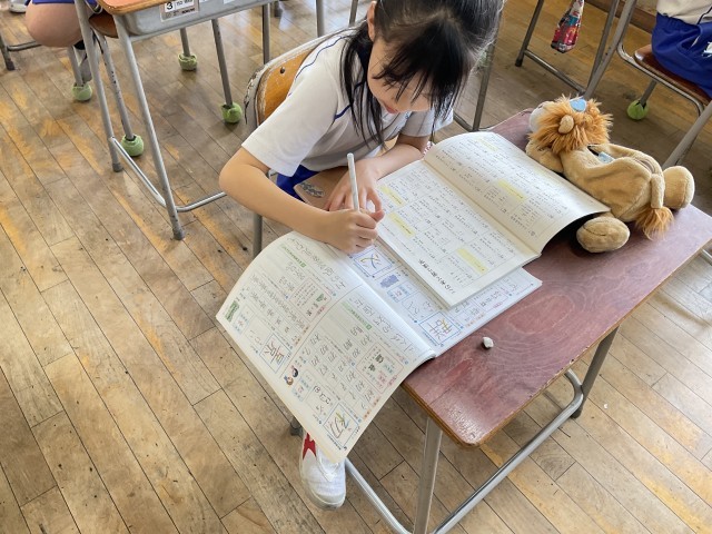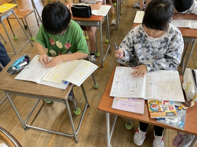 漢字の学習ノートを使って新出漢字の学習をしています。教科書を見て読み方を調べたり、筆順や画数を確かめたりしながら進めています。