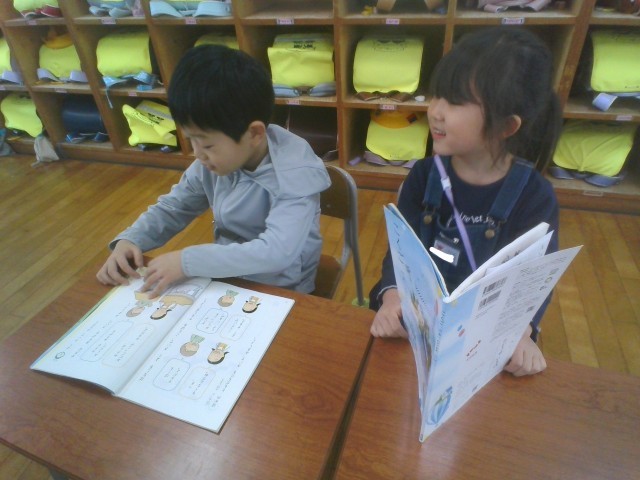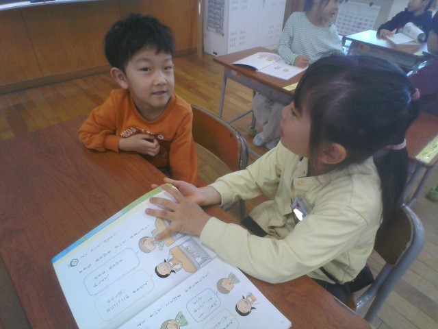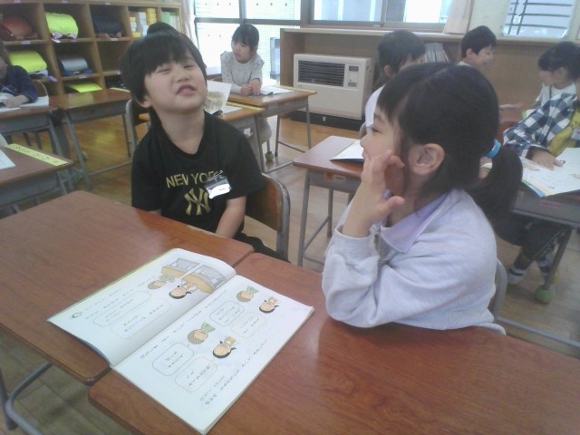話したり聞いたりすることは、大切です。国語科「よくきいて、はなそう」の学習では、近くの友達と好きな食べ物や動物、遊び等を聞いて答える学習をしています。最初はどのように話せばよいのか分からない子供たちも、例を見たり、話題を変えて繰り返したりして練習することで、上手に話すことができていました。