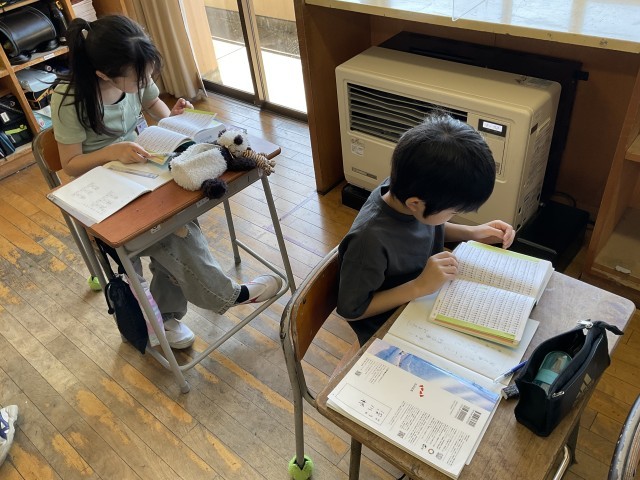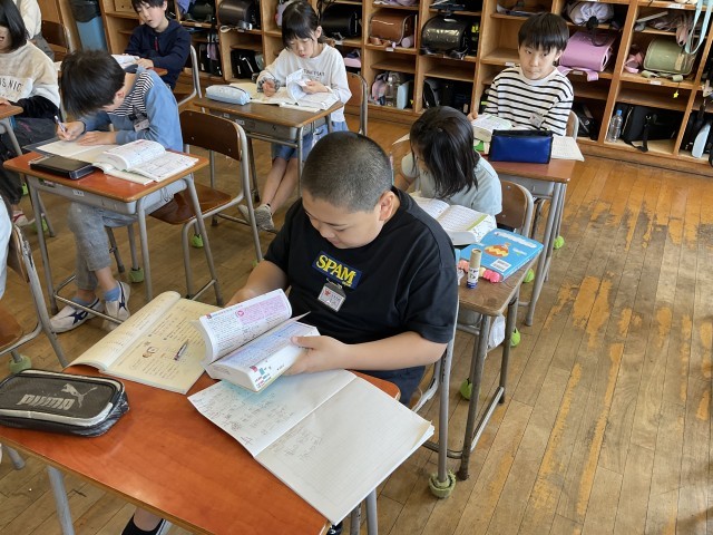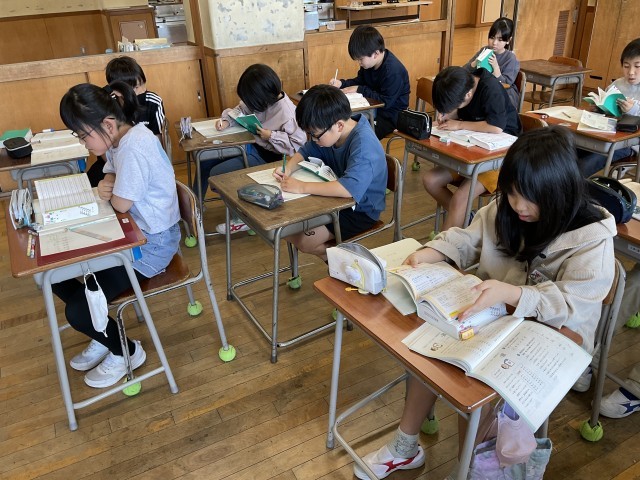 漢字辞典を使って漢字の音訓読みや意味について調べています。教科書に載っている漢字以外にも、自分の名前に使われている漢字や興味のある漢字について調べ、漢字に込められた意味を知って驚く様子が見られました。