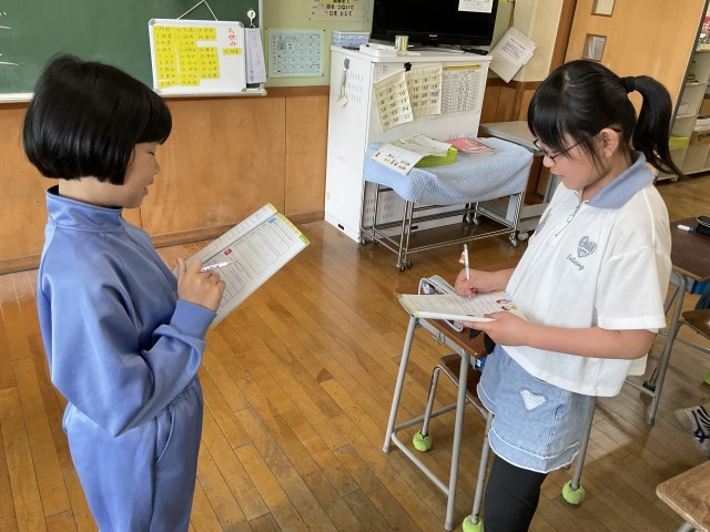 「What 〇〇〇〇 do you like? 」と〇〇〇〇に〝スポーツ、アニマル、フード〟を当てはめ、尋ねる活動をしました。聞かれた人は、項目に合わせて「I like 〇〇〇〇/ I don’t like 〇〇〇〇」と伝えていました。