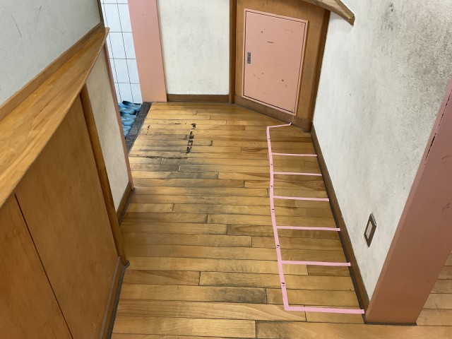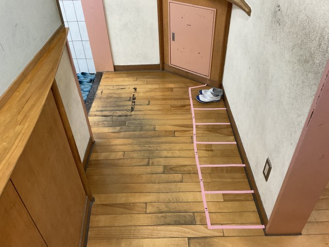 「トイレに行くとき、みんながくつをバラバラにしてて・・・」と子供から相談がありましたが、どうしたらみんなが気持ちよく使えるかを自分たちで考え、テープで印をつけ、くつを置く場所をつくっていました。