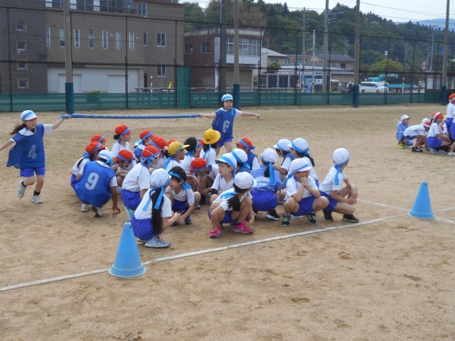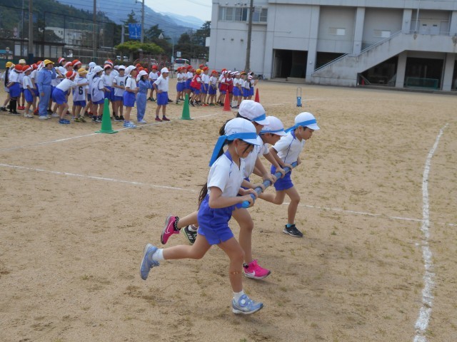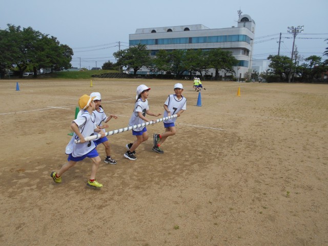 運動会練習の様子です。今日は台風の目の練習をしました。初めてグラウンドで練習しました。体育館と違い、足下が滑ることに悪戦苦闘しながらも、棒を次のグループにつないでいました。棒を跳ぶのにもだんだん慣れてきた様子でした。