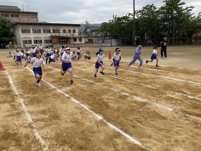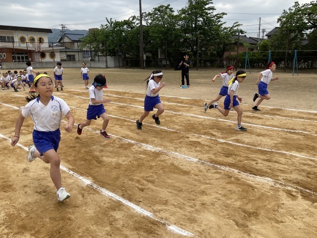 5月の50m走記録会。タイムが近い仲間と一緒に走りました。