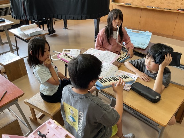 歌と鍵盤ハーモニカの練習をペアやグループで取り組んでいます。リズムを合わせたり、指遣いを確かめ合ったりしていました。
