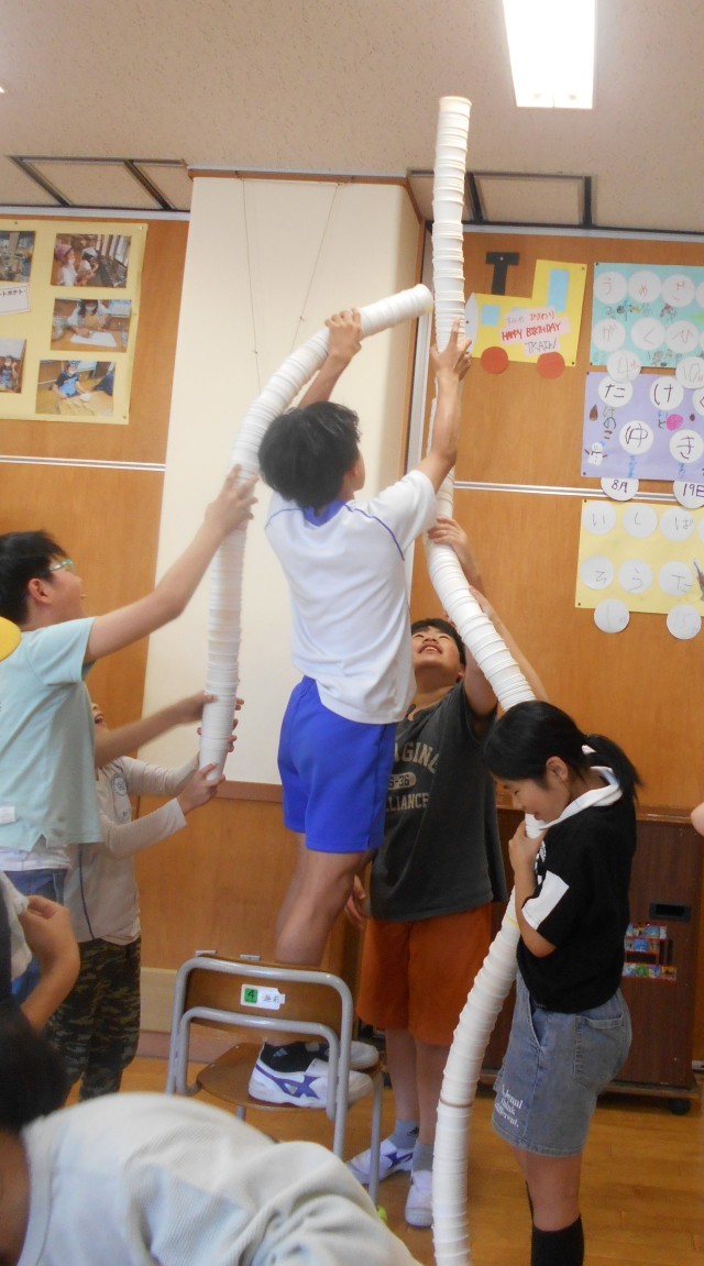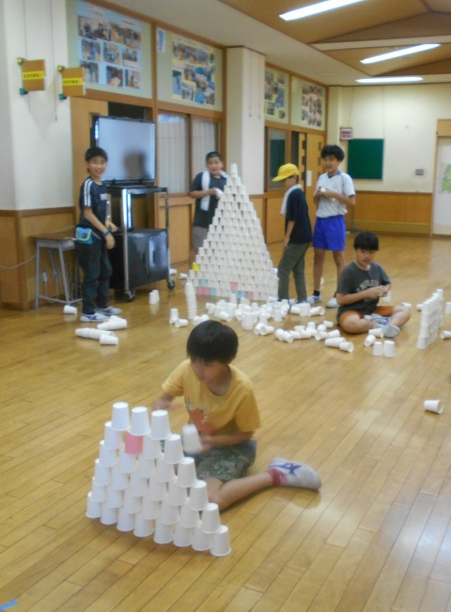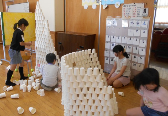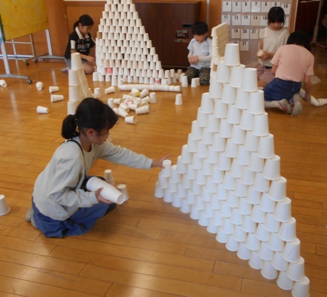5月28日(水) ムーブメントクラブ 紙コップを使って 公開日 2025/05/28 更新日 2025/05/28 学校 たくさんの紙コップを使って、友達と一緒にタワーを作ったり、城壁を作ったりしました。また、紙コップを倒さずに何段跳べるか挑戦していました。片付けまでも紙コップを重ねてどれだけ高くなるか楽しみました。 +1