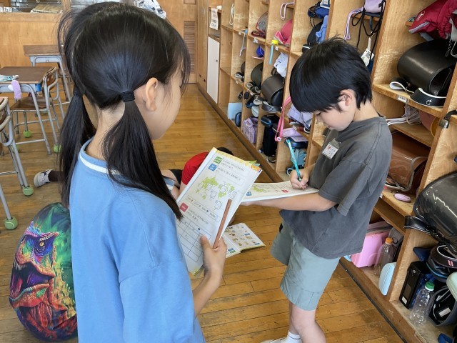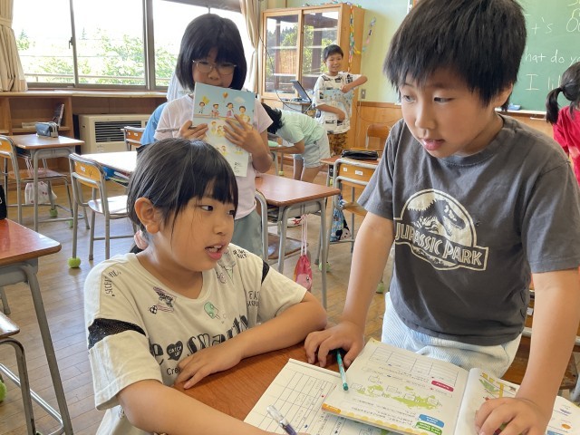 「It's 〜 . What do you like ?」と、天気に合わせて何をするかを尋ねる活動をしました。制限時間内に多くの仲間と関わろうと熱心に取り組んでいました。