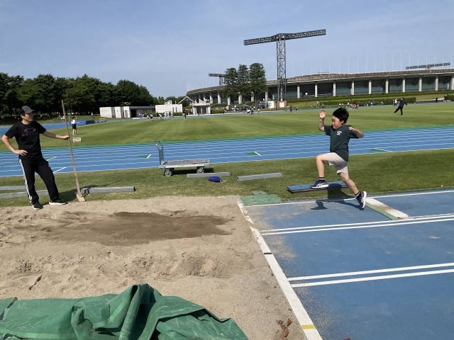 コンバインド競技に向けて、ウォーミングアップをしています。まずは、走り幅跳びに出場します。