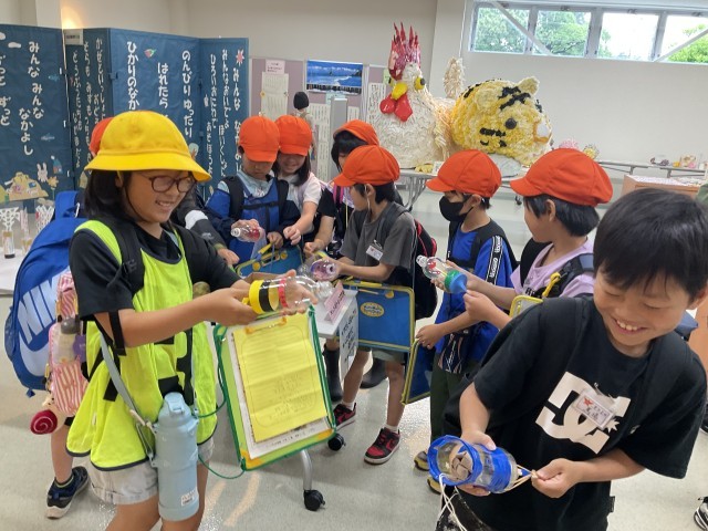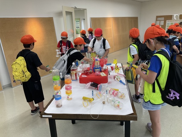 使用済みのペットボトルや牛乳パック等を使ったおもちゃも紹介されており、子供たちは嬉しそうに触ったり遊んだりしていました。