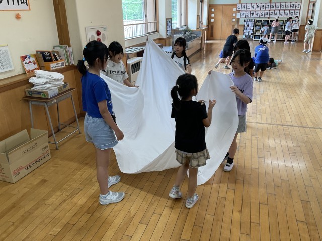 宿泊学習に向けて、休み時間に仲間と協力してシーツをたたむ練習をしています。