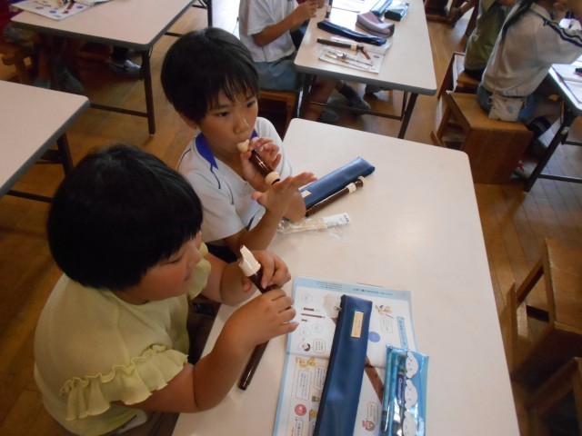 6月25日(水) 3年生 初めてのリコーダー 公開日 2025/06/26 更新日 2025/06/26 3年生 音楽では、初めてリコーダーを使いました。リコーダーの持ち方、姿勢に気を付けて音を出しました。きれいな音を出すことができるように練習していきます。