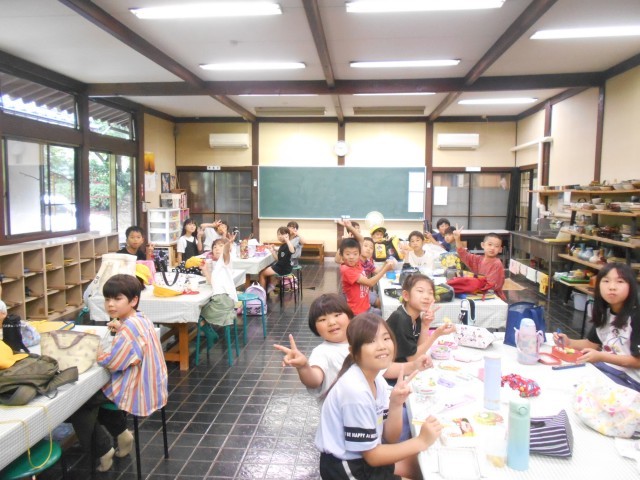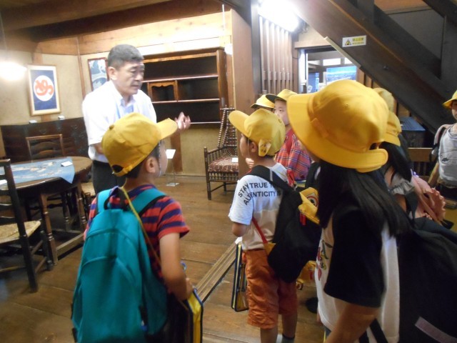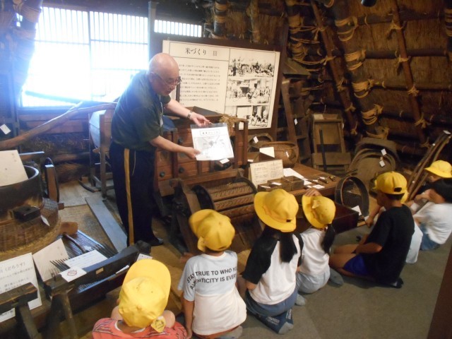 民俗民芸村での見学の様子です。昔の人が住んでいた家や使っていた道具などの見学をしました。子供たちは職員の方の話を真剣に聞いていました。熱心にメモをとる様子も見られました。