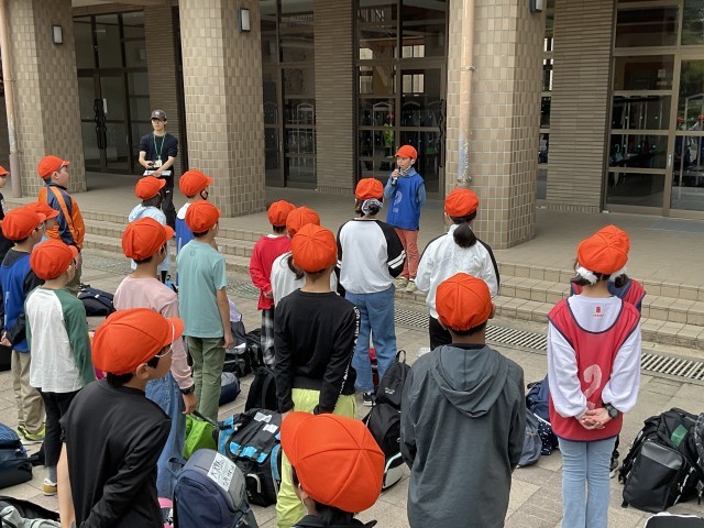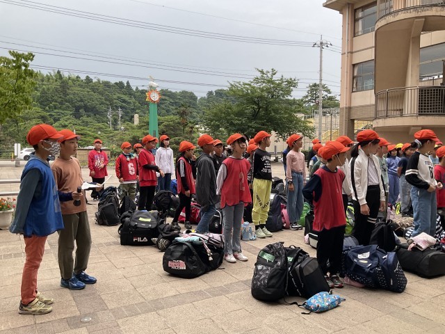 宿泊学習の出発式の様子です。自分のめあてや班・全体で決めた約束事を守り、安全に楽しく活動してほしいと思います。