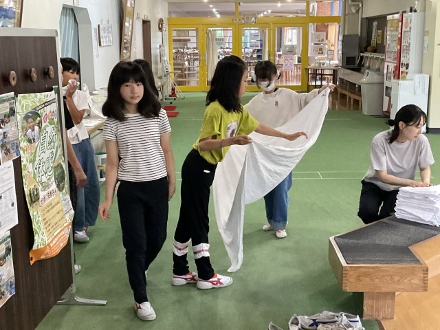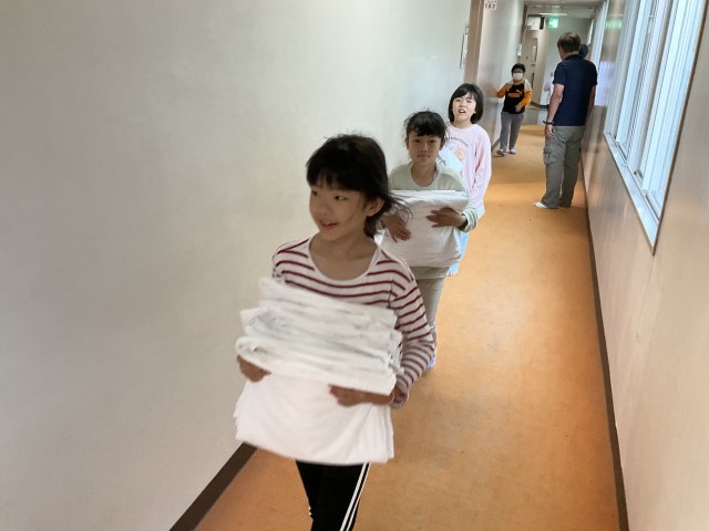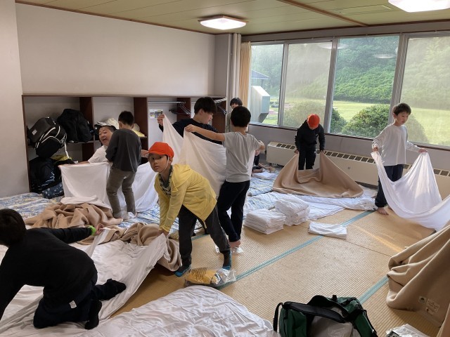 同じ部屋の仲間と協力してシーツや枕カバー、布団の片付けを行っています。
