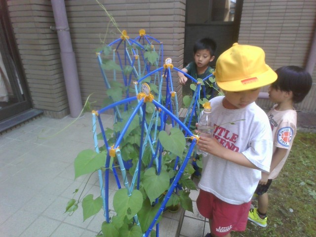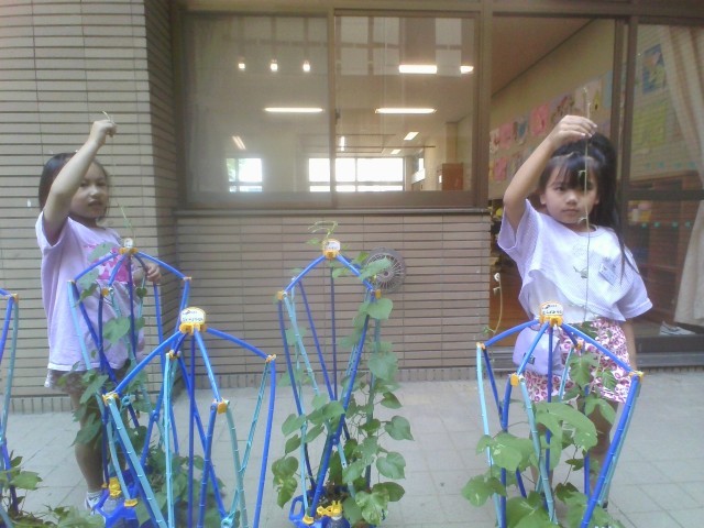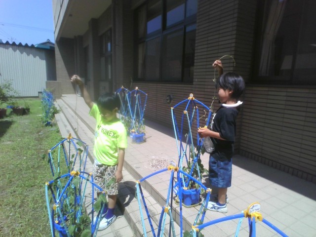 暑い日が続いています。5月から育てているあさがおがぐんぐん成長していることに気付き、つるがどれくらいのびているのかを確かめる子供たちがたくさんいました。「わたしの鼻くらいの高さだった」「頭よりも長くなっている」と言って大喜びでした。これからの成長も楽しみですね。