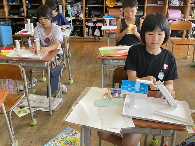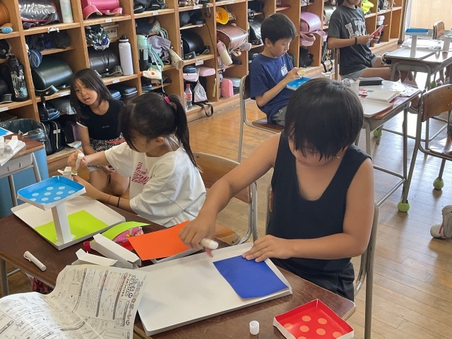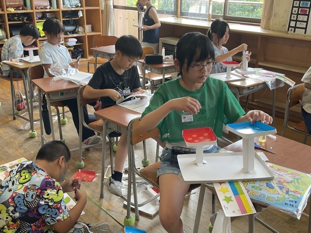 図画工作では、テーマに合わせてビー玉が転がったり曲がったり落ちたりするコースを作っています。