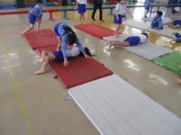 体育では、マット運動をしています。写真は大きな前転の練習の様子です。他にも、後転、開脚前転、開脚後転を練習しています。ずいぶん上達してきました。