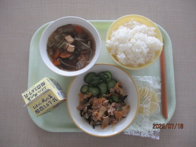 今日の献立は、豚肉キムチ丼 豆腐ともずくのスープ きゅうりもみ 冷凍パイン 牛乳 でした。