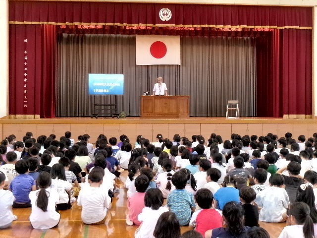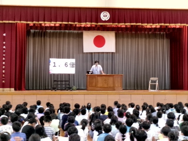 1学期の終業式が行われました。始めに、児童代表の人たちが、友達と仲よくなったことやできるようになった等1学期に頑張ったことを落ち着いて発表しました。その後の校長先生の話や夏休みのプールの使い方や生活についての話を、子供たちは、静かに聞いていました。
