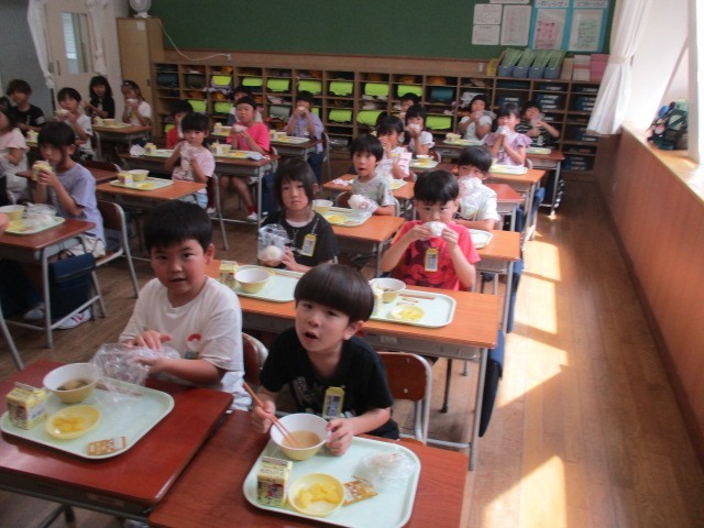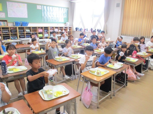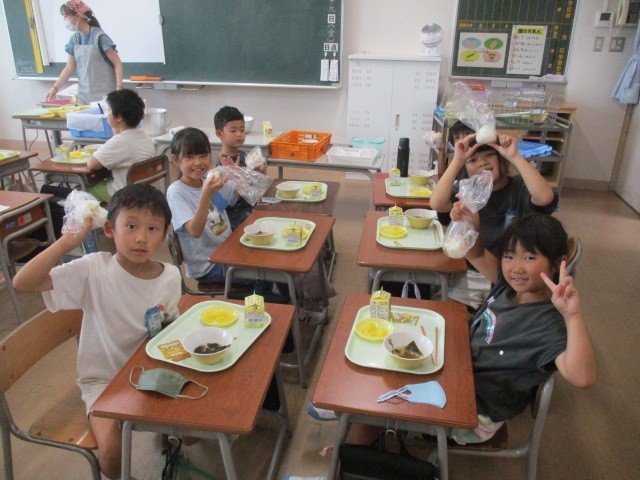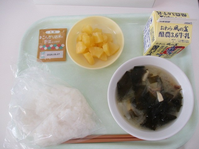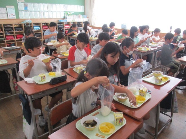 今日は、9月1日の「防災の日」にちなんだ献立です。災害が起きたときの非常食を意識し、ナイロン袋を利用したセルフおにぎり、長持ちする野菜を使ったみそ汁やフルーツ缶詰が出されました。自分で作るおにぎりを美味しく味わいながら、防災について考える機会にもなった給食となりました。