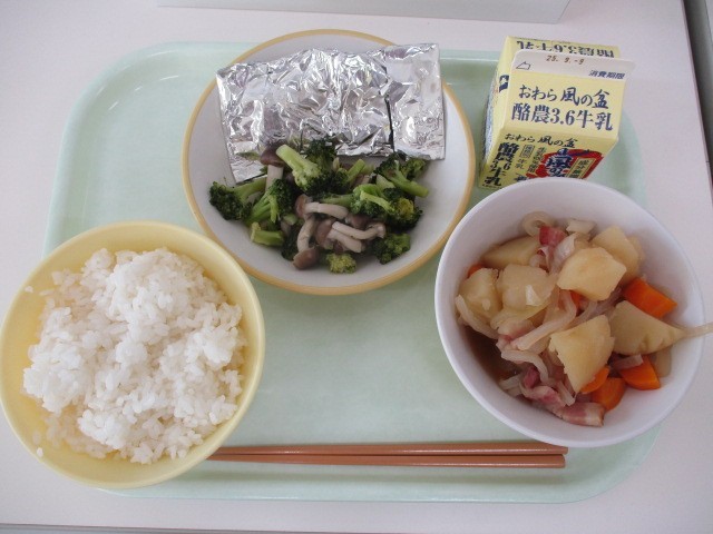 9月3日(水)今日の給食 公開日 2025/09/03 更新日 2025/09/03 給食室から 今日の献立は、ごはん ベーコンとじゃがいもの煮物 さばの銀紙焼き ブロッコリーときのこのソテー 牛乳 でした。