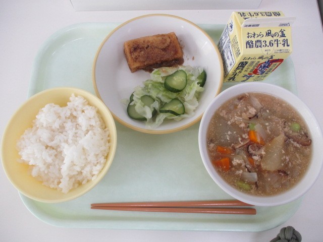 今日の献立は、ごはん 揚げ出し豆腐のごまだれかけ 冬瓜のそぼろあん きざみ和え 牛乳 でした。