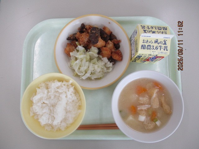 今日の献立は、ごはん 五目みそ汁 鶏肉とレバーの甘辛和え そえ野菜 牛乳 でした。