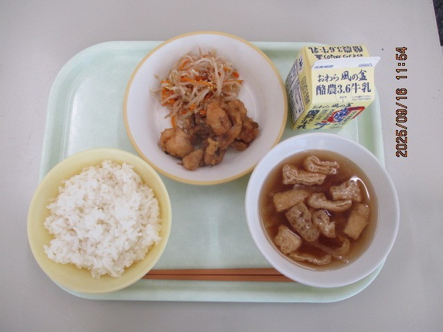 今日の献立は、ごはん 鶏肉のねぎソースがけ 沢煮椀 もやしのナムル 牛乳 でした。