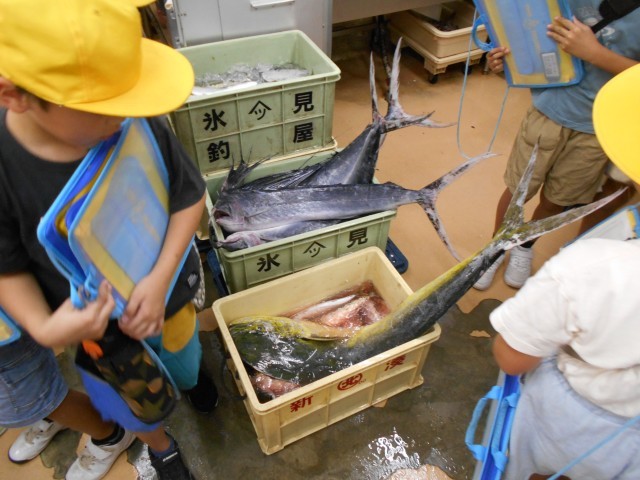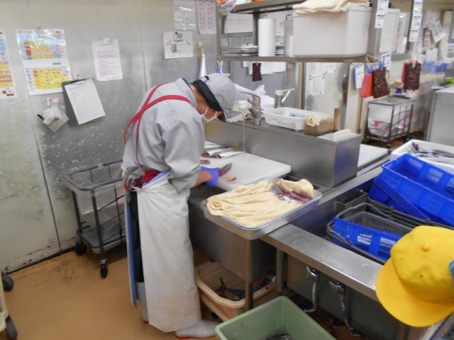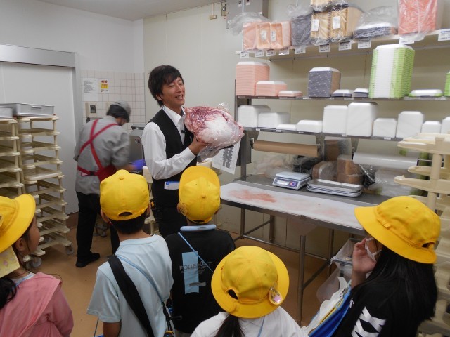 鮮魚コーナー、精肉コーナーでは、大きな魚やお肉を切って商品にする流れを見せていただきました。