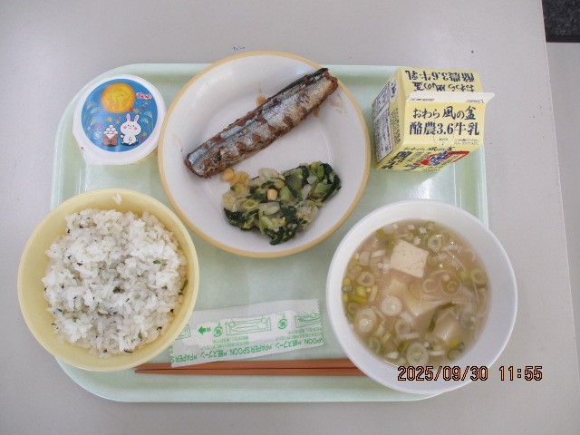 今日はお月見献立でした。メニューは、菜めし  さんまのマーマレード煮  お団子汁  コーン和え  お月見ゼリー  牛乳  でした。