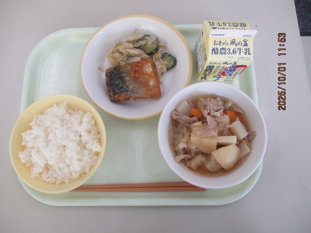 今日の献立は、 ごはん  豚肉の炒め煮  さばの竜田揚げ  ごま和え  牛乳  でした。
