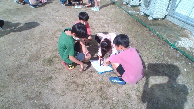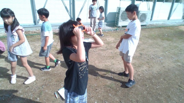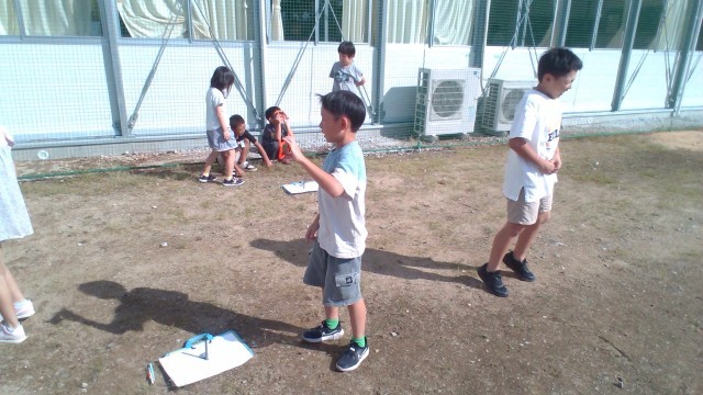 子供たちはより正確な観察ができるように方位や正しい向きを友達と確かめ合って活動していました。